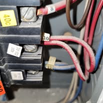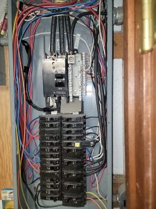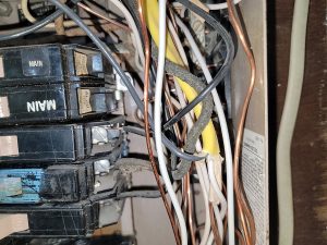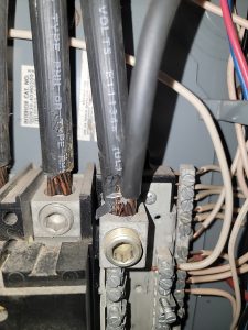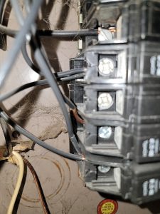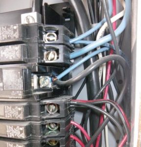 Here we can see a double tap at the top and bottom breaker – two wires going in where you’re only supposed to have one connection