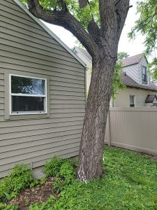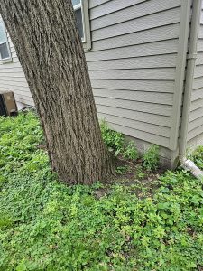 You should not plant trees so close to a home – the trunk and root system can cause amazing pressure on Foundation walls and cause instability