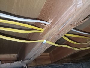 Yes the wires are stapled to the floor joist, yeah it’s stupid and the potential fire hazard